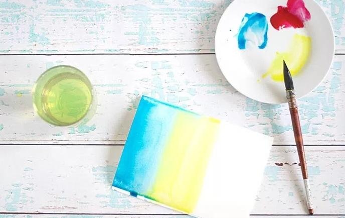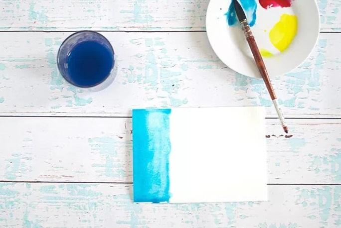 Теми же цветами начните закрашивать третью часть заготовки. Пока предыдущая размывка еще влажная, наносите следующий тон. Затем, после наложения третьего оттенка, дайте акварели смешаться. Ну как, не устали? Вся работа займет буквально 5 минут. Похоже, такие открытки – настоящее спасение для занятых людей!